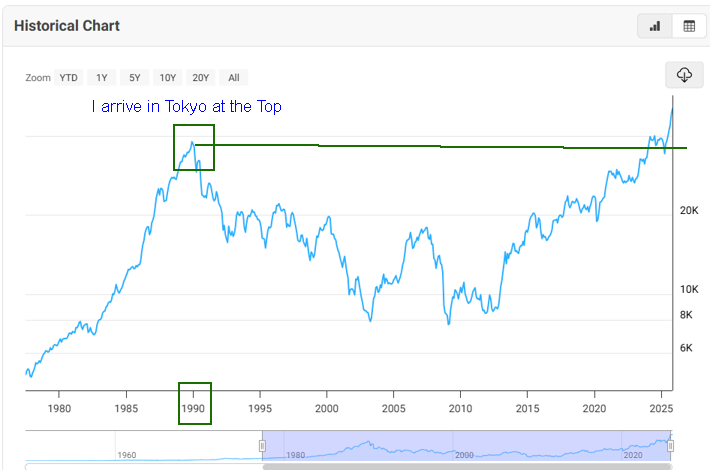 Japanomania was reinforced by the soaring Nikkei stock index. Two weeks after I arrived in Tokyo, as a single twenty-four-year-old, the index hit 39,000, which was the top for the next 30 years! It is the subject of another post, but boy was Tokyo rocking and rolling back then (and I am not talking about the markets).