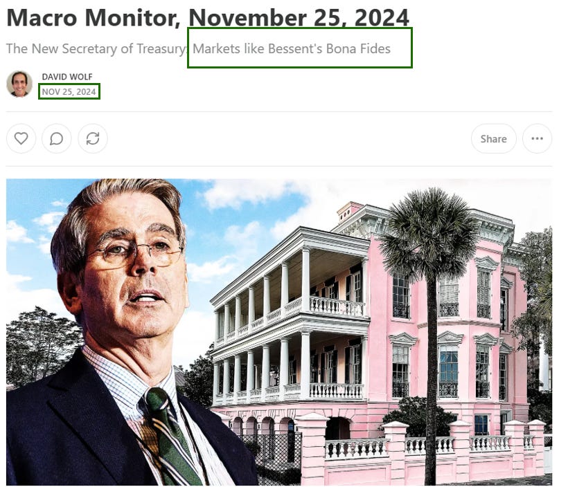 Last November, investors (including myself) celebrated the appointment of Scott Bessent as Trump’s Treasury Secretary. We devoted a post to the subject one year ago, almost to the day. Here is a print of the headline.