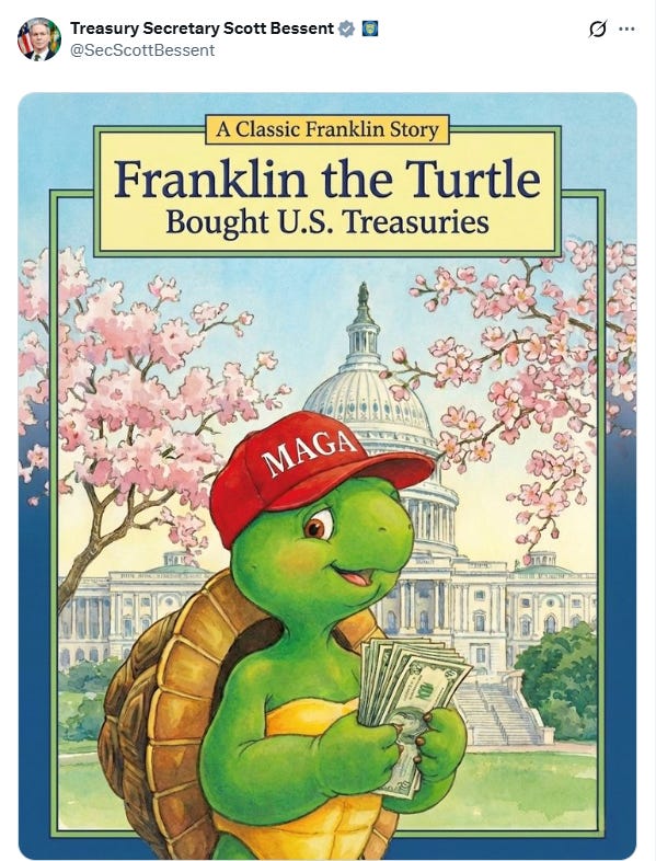 I asked around, and no one seemed to know what it meant. I certainly didn’t have a clue. I do know that the country has a fiscal deficit of 7% of GDP, and if Secretary Bessent is depending on Franklin the Turtle to finance us, we are in dire straits.