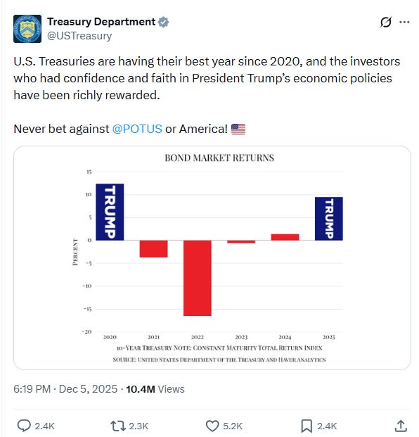 I won’t insult your intelligence, dear Reader, like Bessent does, by reminding you that lower interest rates and strong bond market performance are signs of economic weakness and even distress. You already know that.